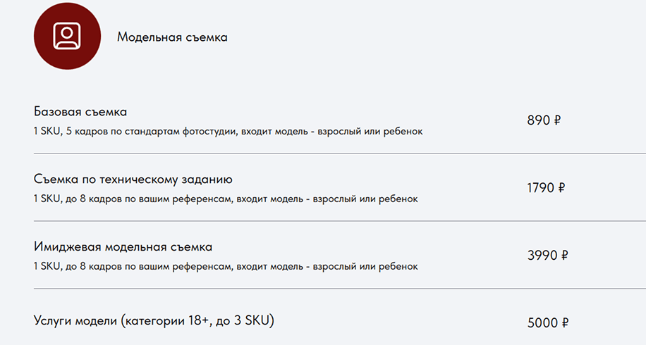 Магнит Маркет предлагает своим селлерам воспользоваться фотостудией. К примеру, базовая съемка - 1 SKU, 5 кадров по стандартам фотостудии, входит модель - взрослый или ребенок, обойдется в 890 рублей. А за имиджевую модельную съемку - 1 SKU, до 8 кадров по вашим референсам - придется заплатить 3990 рублей. В бюджет 10 000 рублей В продавец укладывается.(см скриншот)